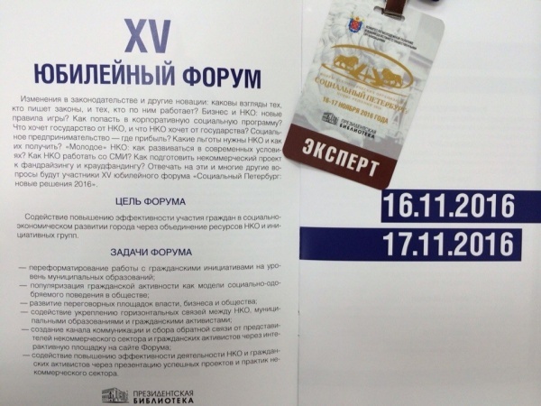 XV, юбилейный, форум «Социальный Петербург: новые решения» прошел в Президентской библиотеке им. Б.Н. Ельцина 16 и 17 ноября 2016 года. Форум был организован комитетом по молодежной политике и взаимодействию с общественными организациями Санкт-Петербурга и стал поистине знаковым событием для всех, кому важны динамические изменения в сфере развития НКО.