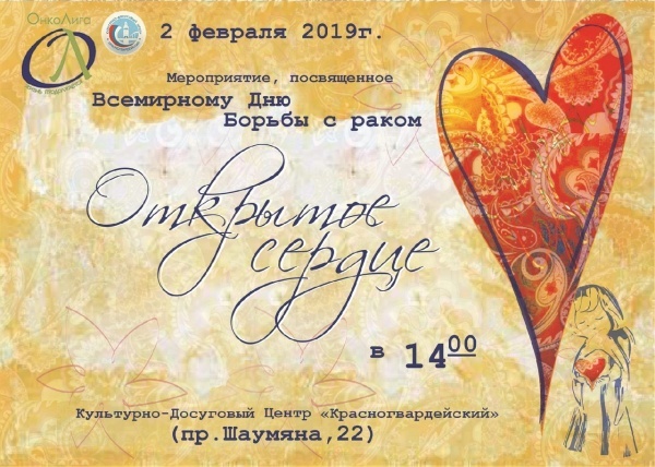 Дорогие друзья, приглашаем вас 2 февраля в городе Санкт -Петербург на мероприятие "Открытое сердце", посвященное всем, кто борется с этим недугом, волонтёрам, всем сопереживающим и не равнодушным людям!