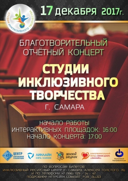 Ура! Мы наконец-то можем пригласить вас на одно из главнейших событий в жизни Студии Инклюзивного Творчества* г. Самара этого года - благотворительный отчетный концерт, который пройдет 17 декабря 2017 года!