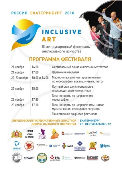 Третий Международный фестиваль инклюзивного искусства Inclusive Art пройдет с 21 по 23 ноября в г. Екатеринбург на площадке Свердловского государственного областного Дворца народного творчества (ул. Фестивальная, д. 12)! Вы познакомитесь с уникальными людьми, создающими волшебный мир инклюзивного театра, хореографии, музыки, вокала и визуального искусства!